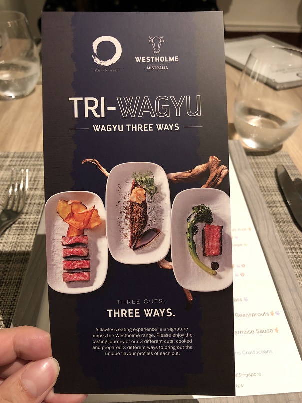 For the selection of entree, we recommend the Tri-Wagyu selection. The details are on the brochure below. It is a partnership arrangement with supplier Culina, using top grade wagyu from Australia.