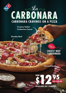 Domino’s is back, and they’ve turned up the flavors with something better than ever — the irresistible new La Carbonara Pizzas! A mouth-watering offering inspired by the classic Italian favorite. Specially crafted to satisfy carbonara cravings in a whole new way, this indulgent twist transforms the beloved pasta dish into a deliciously creamy carbonara and cheesy pizza experience perfect for any celebration.